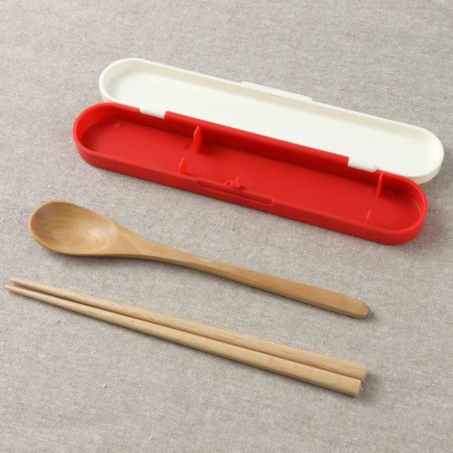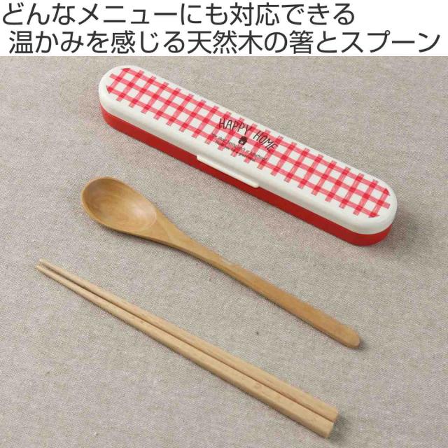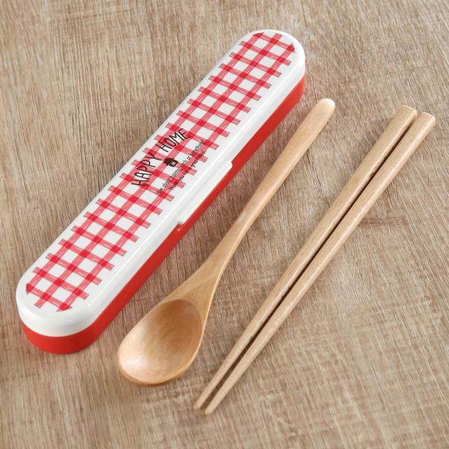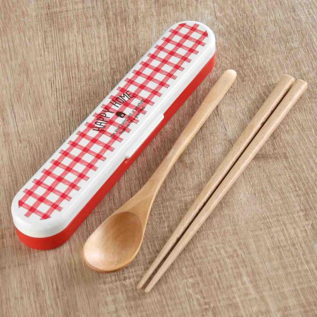 コンビセット ハッピーホーム レッド ( スプーン 箸 18cm お箸 カトラリーセット カトラリー セット お弁当用 女子 チェック柄 18センチ 木製 天然木 弁当 お弁当 持ち運び 携帯用 女性 )