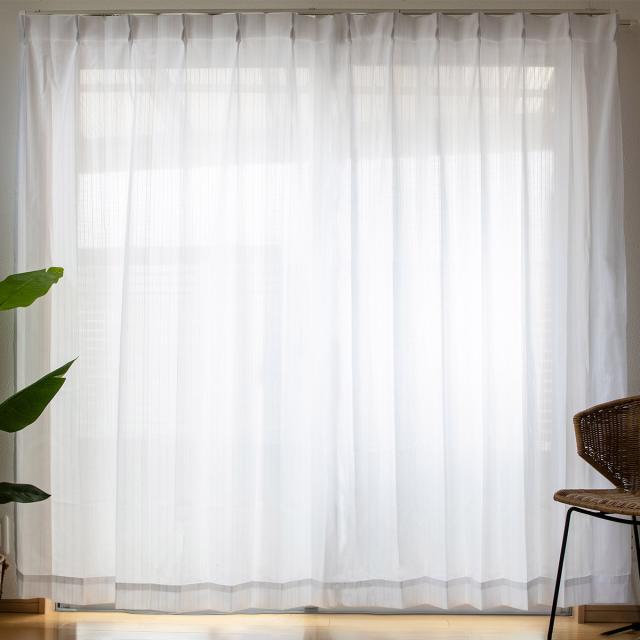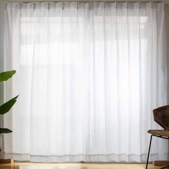 ヒダ山が2つの1.5倍ヒダ仕上げでスッキリとした見た目です。カーテン1枚の幅が150cmなので、2枚お買い求めいただくことで、一般的な掃き出し窓にピッタリのサイズになります。