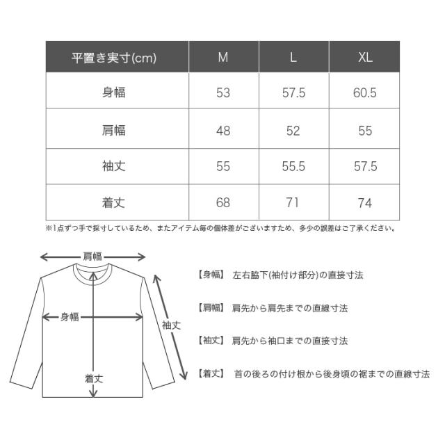 平置き実寸(cm)[身幅/肩幅/袖丈/着丈] M:53/48/55/68 L:57.5/52/55.5/71 XL:60.5/55/57.5/74 ※多少の誤差はご了承ください