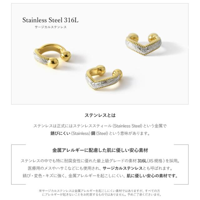 ※ステンレス316Lは金属アレルギーを起こしにくい素材ではありますが、すべての方にアレルギーが起きないことをお約束するものではありません。予めご了承ください。