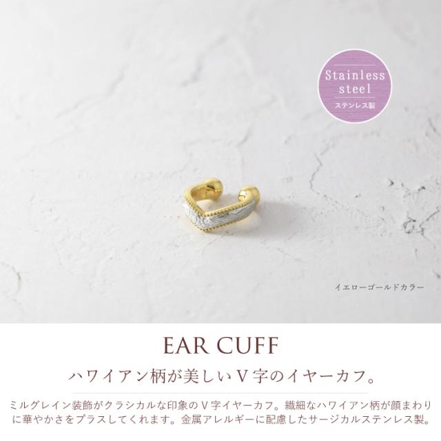 ハワイアンジュエリー イヤーカフ 金属アレルギー対応 V字 ステンレス レディース メンズ 男女兼用 イヤーカフス イヤカフ イヤリング 片耳用 キャッチレス イエローゴールドカラー 軟骨 挟む トレンド ノンホールピアス 痛くない gess236yg