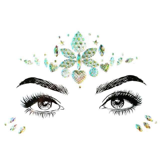 目元や眉間の顔面に貼るジュエルステッカー。貼るだけで簡単に楽しめるシールタイプのアクセサリーは年齢に関係なく大人から子供まで楽しめるボディアクセサリー。カーニバルや祭りやダンス発表会の注目度満点。