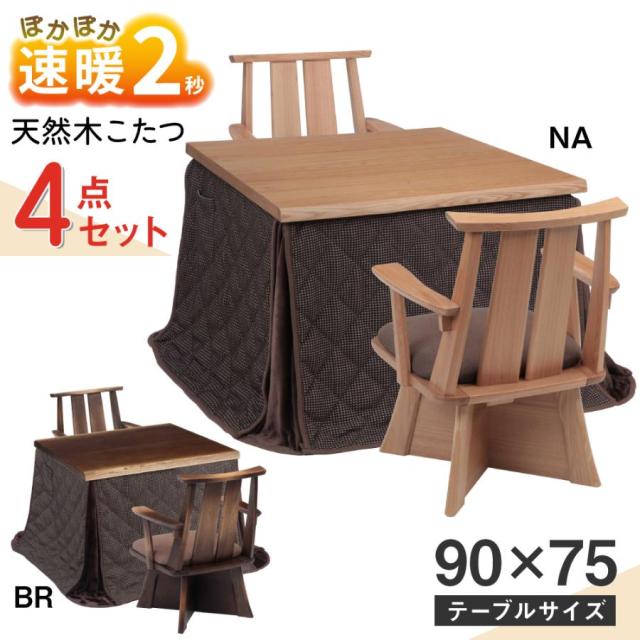 速暖 2秒 ハロゲンヒーター こたつ ダイニングこたつ 日向 4点 セット 2人 2人用 布団付き 長方形 幅90 90×75 コタツ ハイタイプ こたつテーブル リビングこたつ 家具調 モダン 北欧 天然木 テーブル 椅子 回転式 肘付き 掛け布団