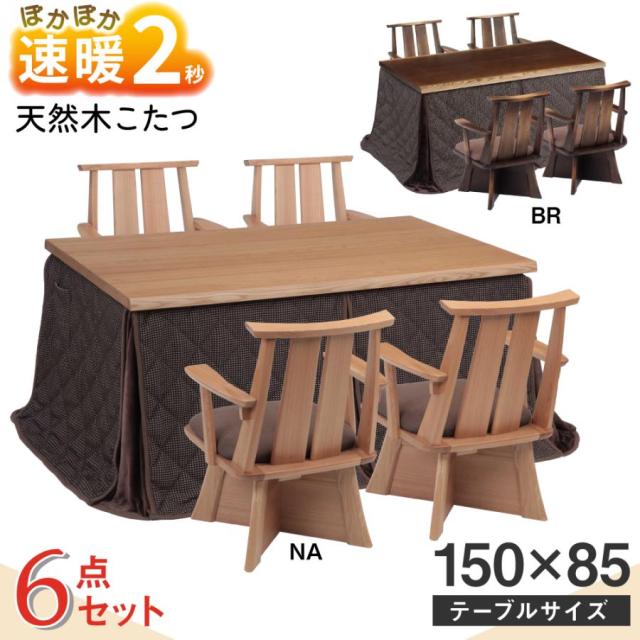 速暖 2秒 ハロゲンヒーター こたつ ダイニングこたつ 日向 6点 セット 4人 4人用 長方形 幅150 150×85 こたつ布団 布団付き ハイタイプ コタツ こたつテーブル リビングこたつ 家具調 天然木 テーブル イス 椅子 4脚 回転式 掛け布団
