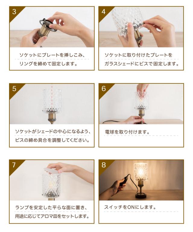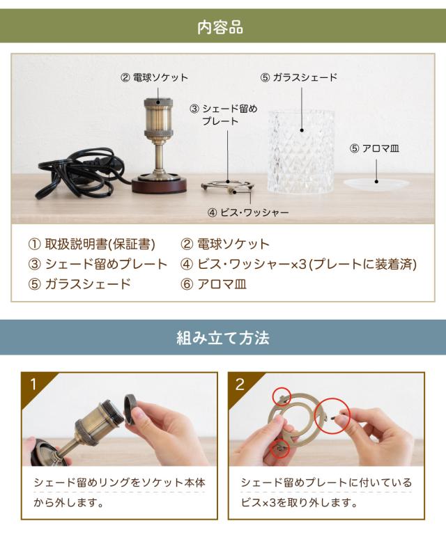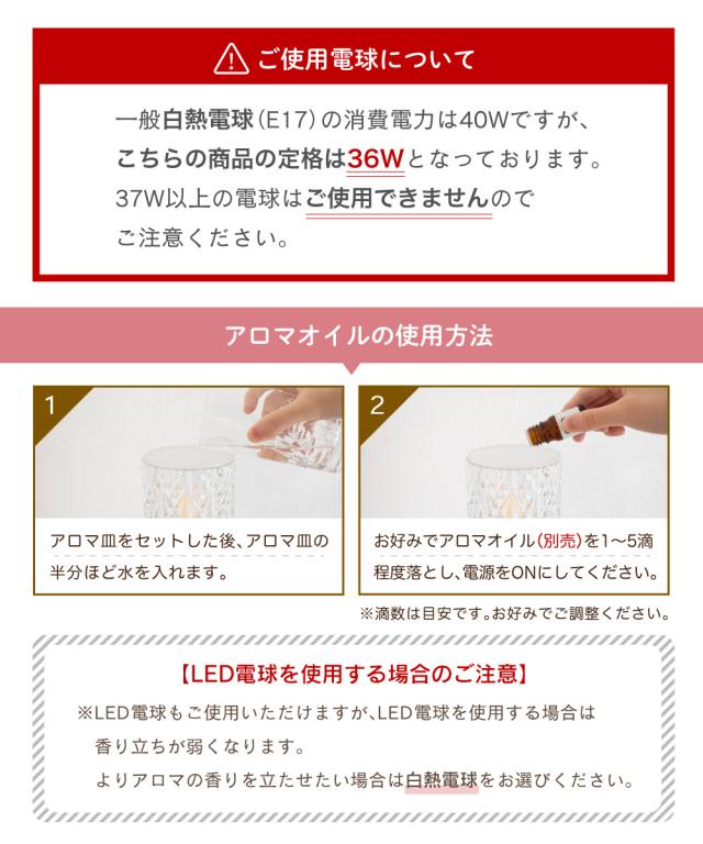 ※アロマランプとして使用する場合、LED電球もご使用いただけますが、LED電球を使用する場合は香り立ちが弱くなります。よりアロマの香りを立たせたい場合は36W以下の白熱電球をお選びください。
