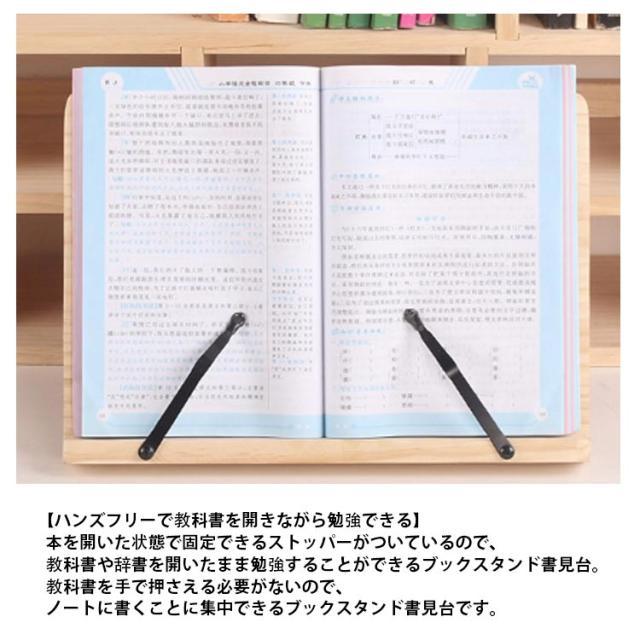 | 【段階調節可能な卓上ブックスタンド書見台】 読書をするときに本を置いたり、ノートパソコンを置いたり、料理をするときにレシピ本を置いたり、動画視聴のためにタブレットを置いたり、便利な使い方がいろいろあるブックスタンド書見台です。 【ハンズフリーで教科書を開きながら勉強できる】 本を開いた状態で固定できるストッパーがついているので、教科書や辞書を開いたまま勉強することができるブックスタンド書見台。教科書を手で押さえる必要がないので、ノートに書くことに集中できるブックスタンド書見台です。 【良い姿勢を保つことが出来る】 本を立てることが出来るので、集中していても背中を丸めることなく、正しい姿勢で読書などの作業をすることができるブックスタンド書見台です。 【角度調節可能なので書き込み作業もできる】 角度を低く調節すると、書き込み作業もできるブックスタンド書見台。付箋やメモなどを貼り付けながら、受験勉強もできるブックスタンド書見台です。 【ページ固定アームが付いた】 ページを開いたまま固定できるアームが付いているブックスタンド書見台。じっくり見たいページをハンズフリーの状態で、開いたまま固定することができるブックスタンド書見台です。 【ノートPCスタンドにもオススメ】 ノートパソコンやタブレットのスタンドとしてもご利用いただけるブックスタンド書見台。テレワーク作業や動画使用などにオススメのブックスタンド書見台です。 【割れにくい松木製】 松木製なので、変形しにくく割れにくいブックスタンド書見台です。また、色と肌触りがとても心地良く、落ち着いた状態で、読書や勉強などをすることができるブックスタンド書見台です。 【滑り止めパッドが付いている】 脚部分に滑り止めパッドがついているので、作業をしていても滑りにくいブックスタンド書見台です。 | |