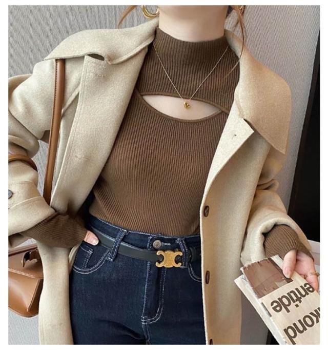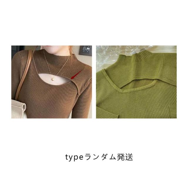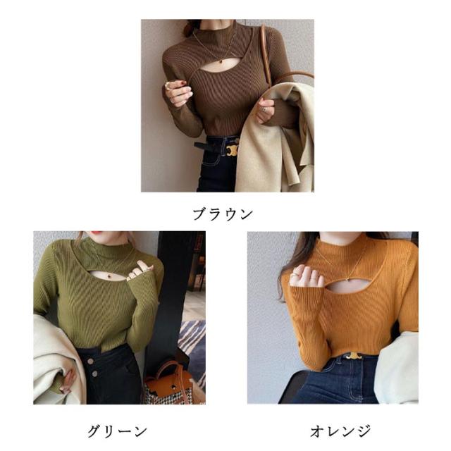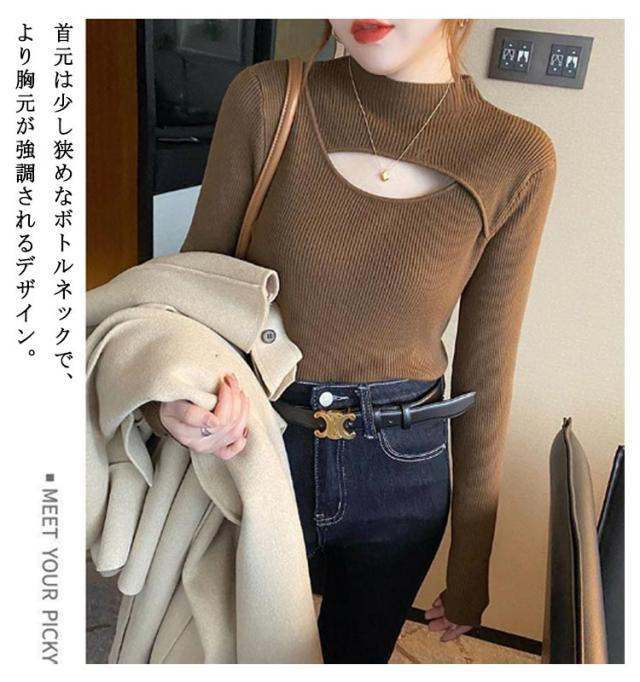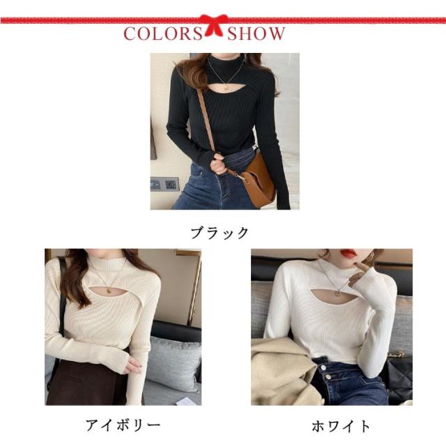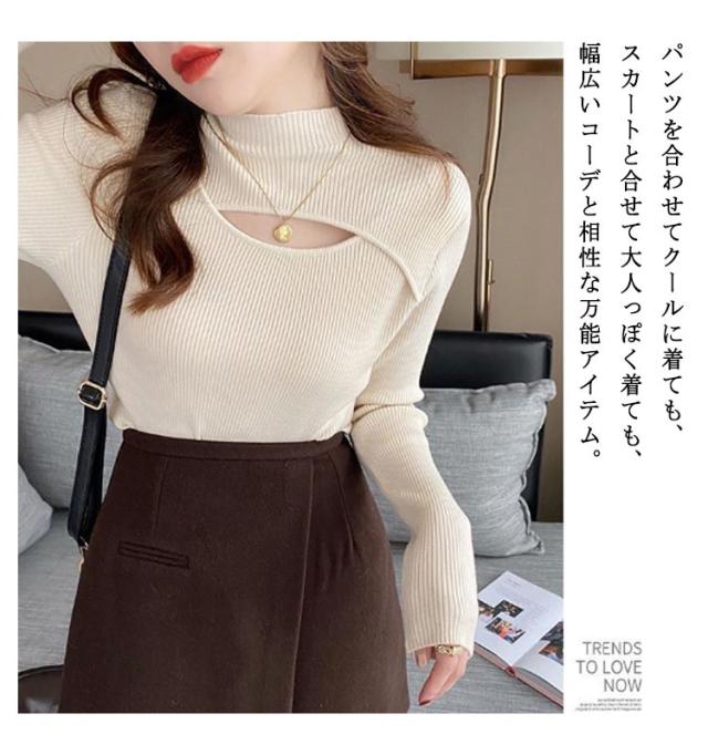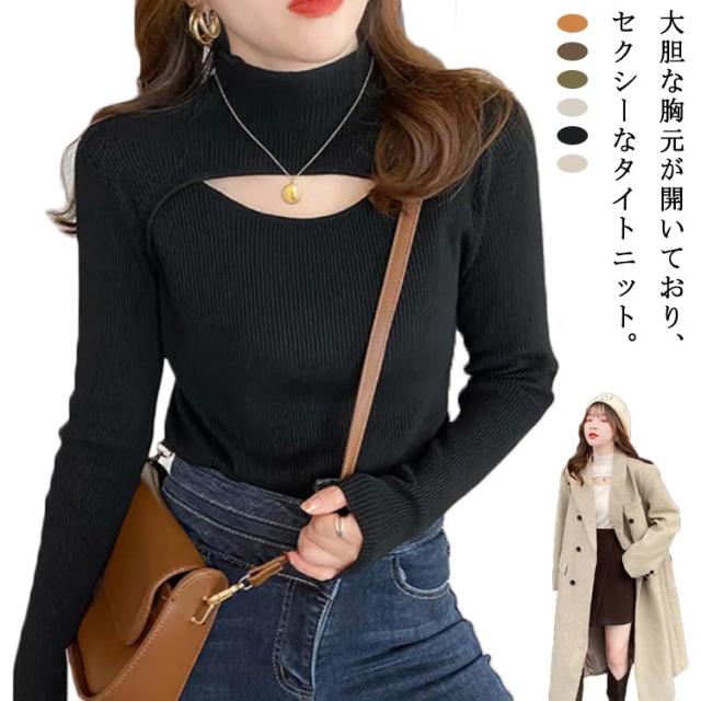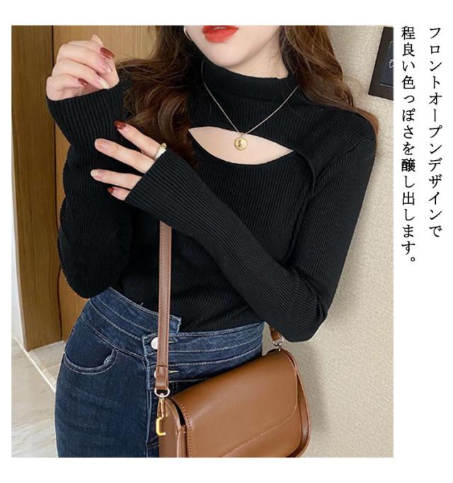 送料無料 フロントオープンニットトップス レディース カットアウト 胸開き タートルネック セーター ニットセーター 長袖 プルオーバー タイト リブニット 胸元 上品 フィット バスト セクシー オフィス カジュアル