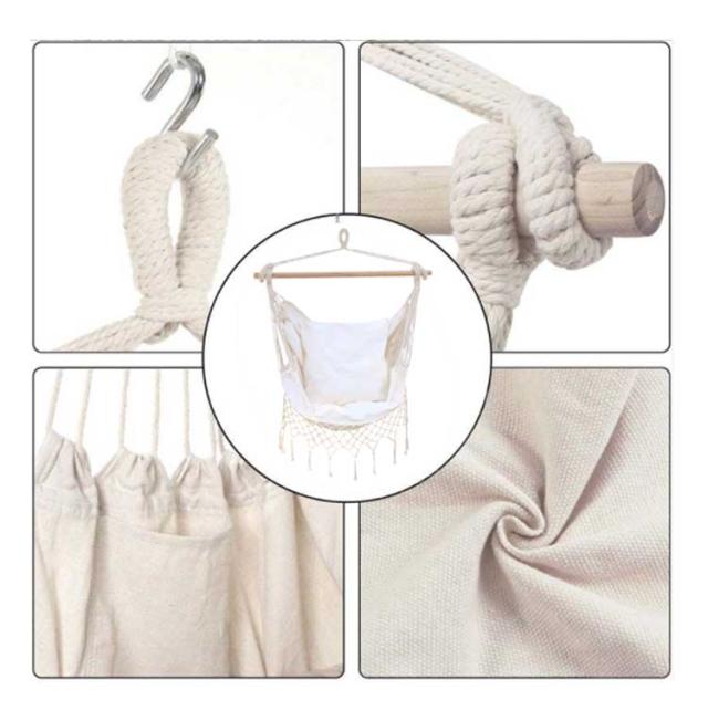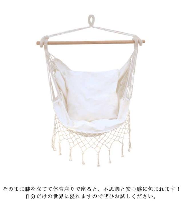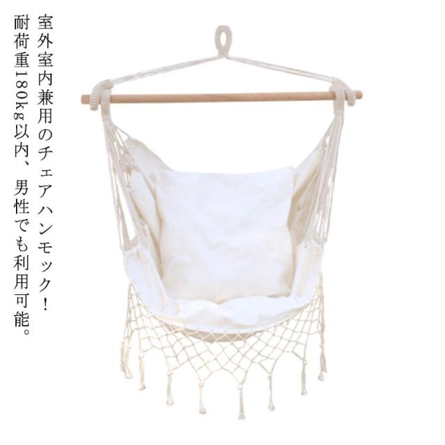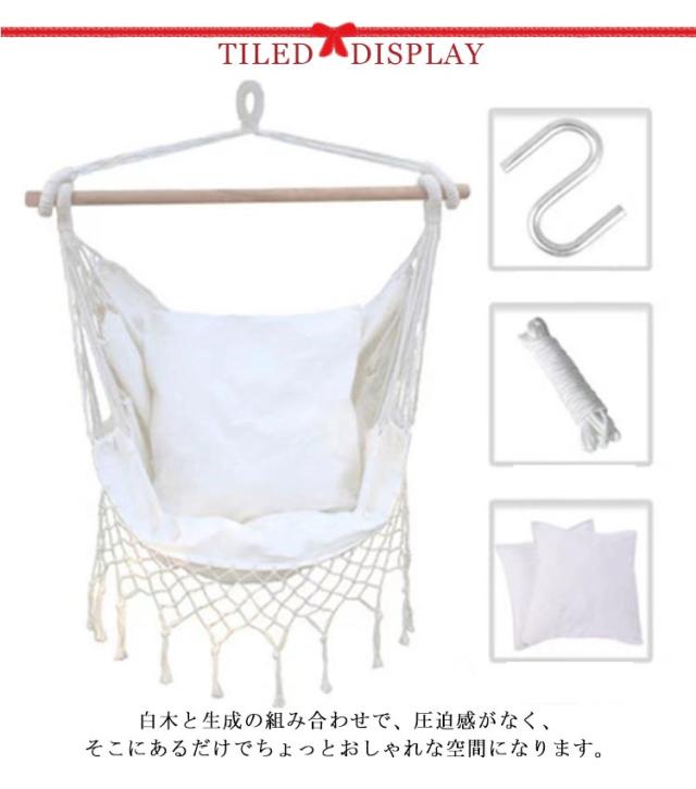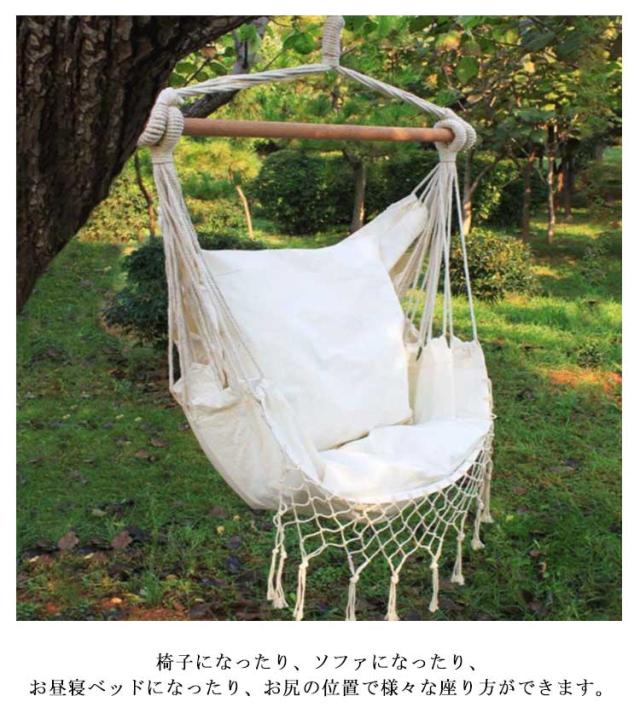 | 室外室内兼用のチェアハンモック!耐荷重180kg以内、男性でも利用可能。 白木と生成の組み合わせで、圧迫感がなく、そこにあるだけでちょっとおしゃれな空間になります。和室、洋室を問わずインテリアのアクセントに。もちろん春から秋まではアウトドアシーンでも大活躍間違いなし! 椅子になったり、ソファになったり、お昼寝ベッドになったり、お尻の位置で様々な座り方ができます。 ソファー代わりにゆらゆら。ちゃんと背もたれがあるので長時間座っても全然疲れません。深く座れば足を延ばしてお昼寝ベッドに。 そのまま膝を立てて体育座りで座ると、不思議と安心感に包まれます!自分だけの世界に浸れますのでぜひお試しください。 男性でもくつろげるゆったりサイズなので、家族みんなで楽しめます! ソフトな綿混生地の素材を採用し、十分な厚さと通気性があり、丈夫で破れにくい、耐荷重はなんと150キロであります。 コットンロープを使用しているので、ポリエステル製に比べ型崩れしにくく、紫外線の影響を受けにくいので長く使えます。 自宅、アウトドア、ビーチ、キャンプ、バーベキュー、釣り、パーティー等々の場面や、アウトドアチェアとしても大活躍! | |