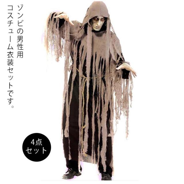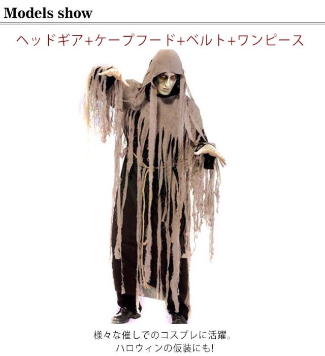 ハロウィン コスプレ ゾンビ 4点セット ヘッドギア+ケープフード+ベルト+ワンピース コスプレ衣装 ヘッドギア付き ローブ ハロウィン衣装 ホラー 怖い 変装 仮装用 おばけ お化け かぶりもの
