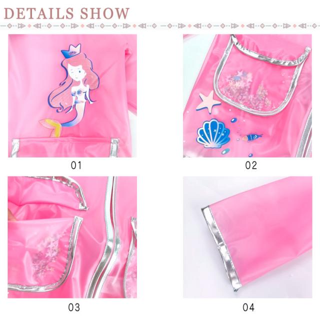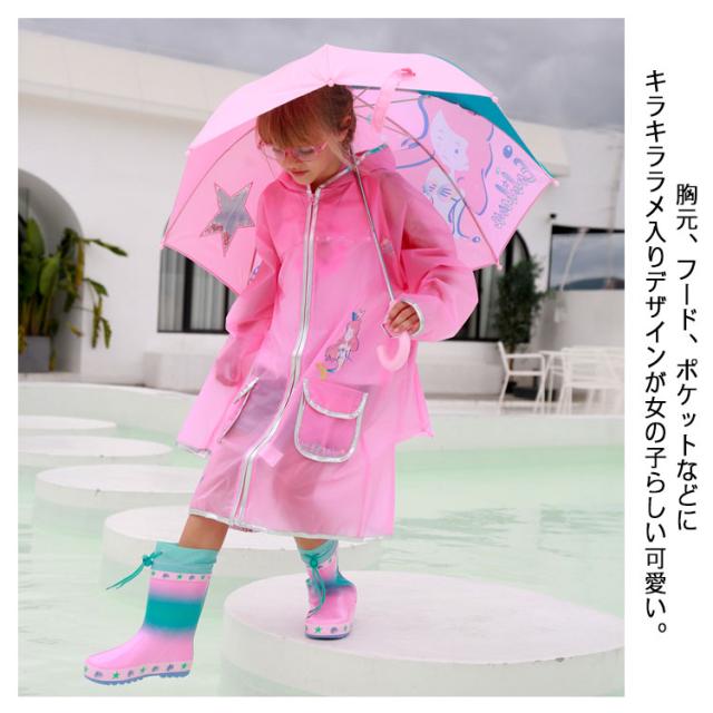 | ランドセルやバックパック対応♪ 柔らかで着心地抜群のキッズレインコート。 胸元、フード、ポケットなどにキラキララメ入りデザインが女の子らしい可愛い。 ランドセルやバックパックを背負ったまま着られるランドセルタック付き、通学・通園にとても便利。 フードは透明窓付きなので、お子様の視線を遮らず、前方が見やすい。 ラグラン袖で動きやすい設計になっています。 | |