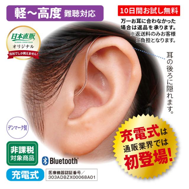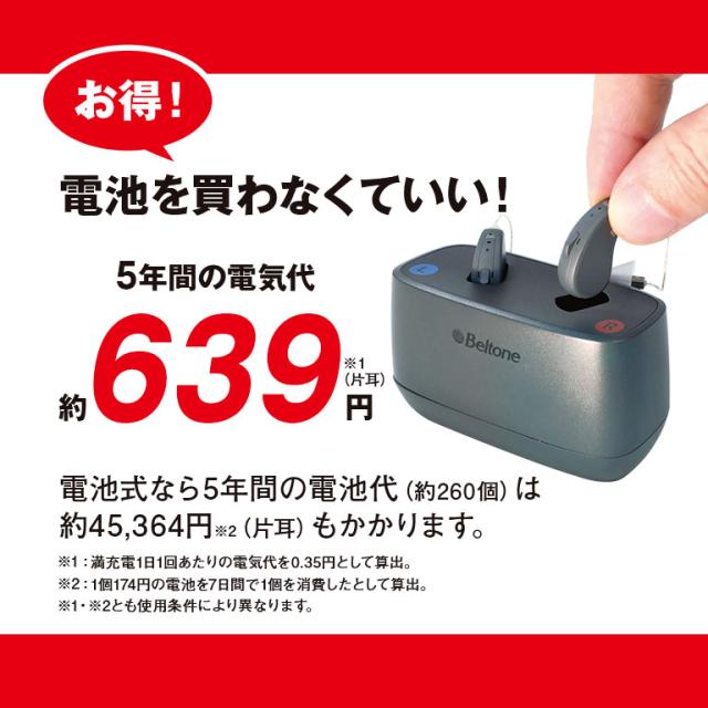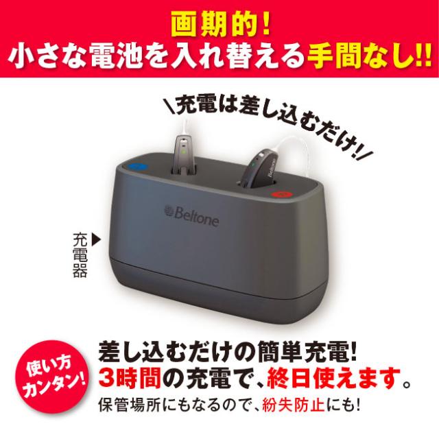 画期的!小さな電池を入れ替える手間なし!電池交換不要の充電式補聴器で、取り扱いが簡単。※両耳装着時