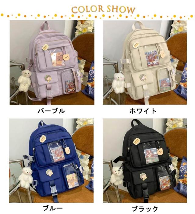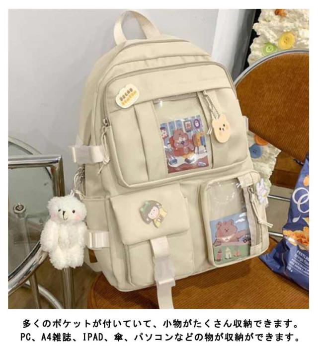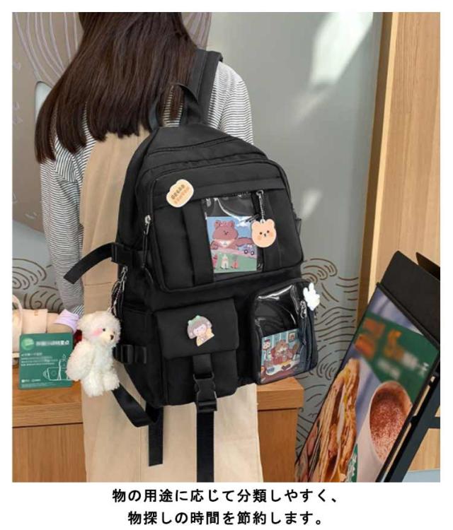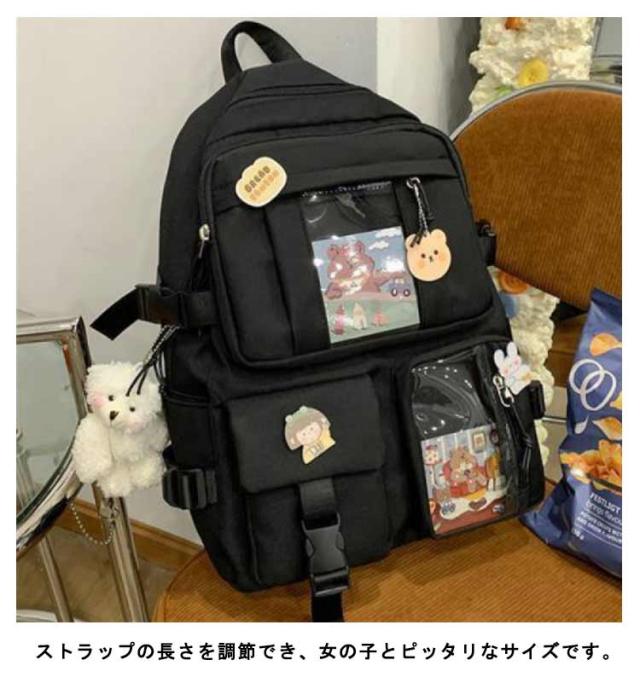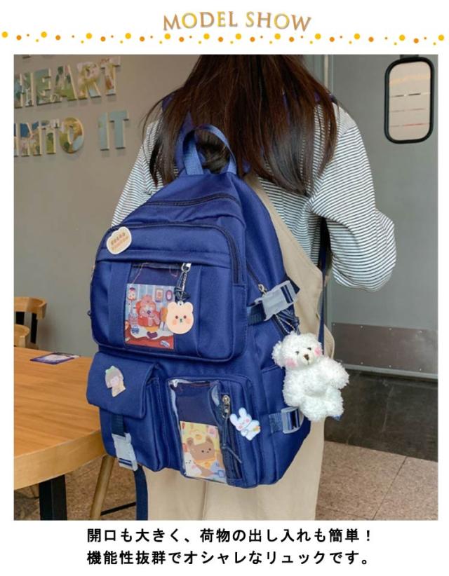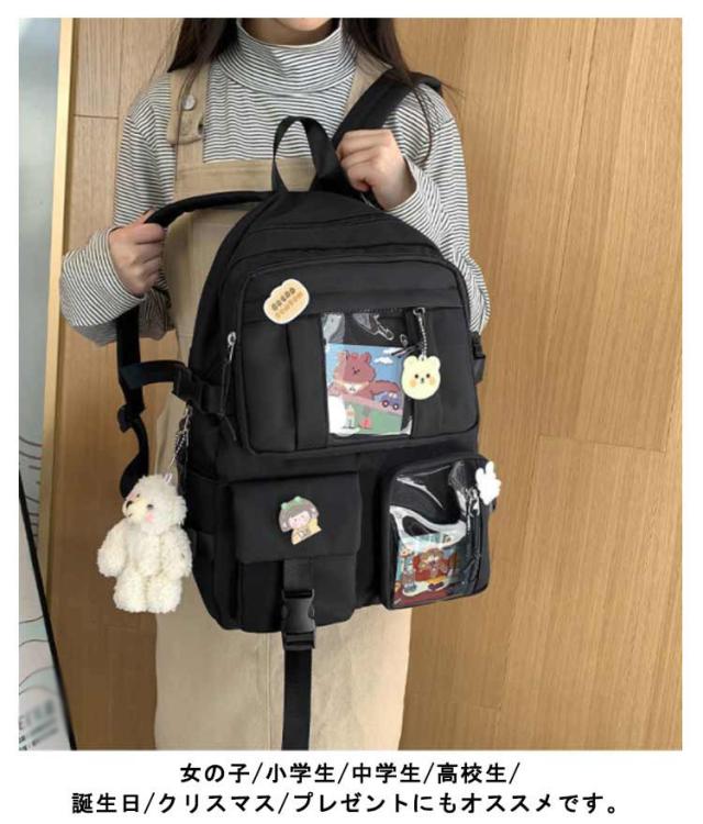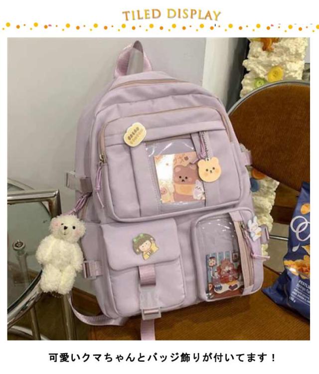 | 開口も大きく、荷物の出し入れも簡単!機能性抜群でオシャレなリュックです。 多くのポケットが付いていて、小物がたくさん収納できます。PC、a4雑誌、iPad、傘、パソコンなどの物が収納ができます。 物の用途に応じて分類しやすく、物探しの時間を節約します。 バッグの透明ポケットで見せたいアイテムで自分の好みにアレンジできます。好きな芸能人やアニメキャラの写真、缶バッジ、ストラップ、ぬいぐるみ、萌グッズなど入れて一目瞭然です。 可愛いクマちゃんとバッジ飾りが付いてます! ストラップの長さを調節でき、女の子とピッタリなサイズです。 女の子/小学生/中学生/高校生/誕生日/クリスマス/プレゼントにもオススメです。 | |