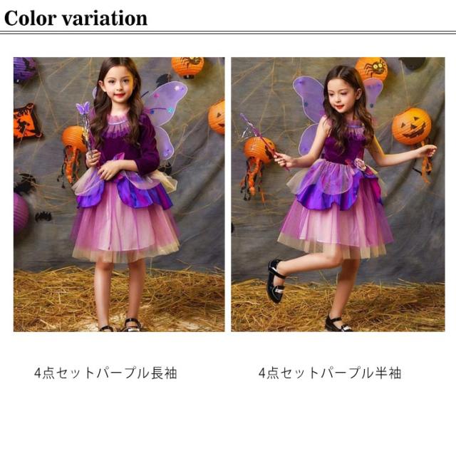 ハロウィン 魔女 コスプレ ハロウィン コスプレ 子供 女の子 ハロウィン 衣装 仮装 4点セット(ワンピース×カチューシャ×棒×つばさ) 可愛い 魔女 魔法使い 魔術師 魔女 帽子 キッズ コスチューム Halloween 悪魔 クリスマス 衣装 誕生日 プレゼント