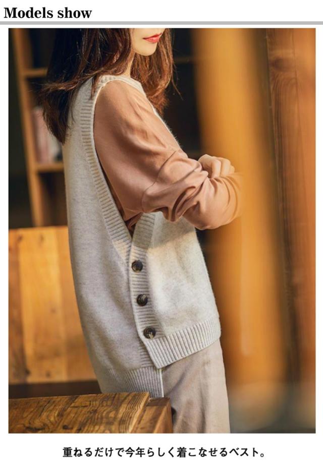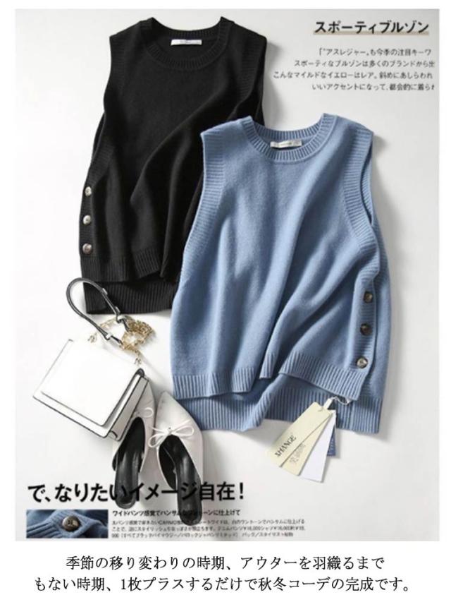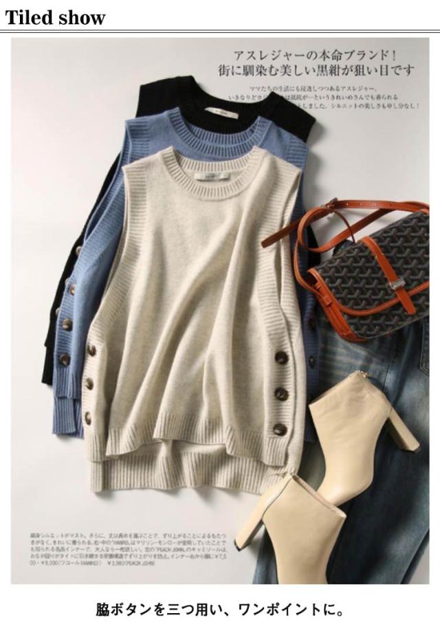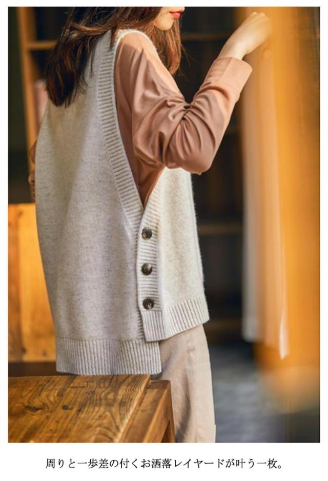 | 前後差のある裾デザインにも雰囲気アップ! 重ねるだけで今年らしく着こなせるベスト。 周りと一歩差の付くお洒落レイヤードが叶う一枚。 ハイゲージのニット素材でカジュアルになりすぎずキレイめな雰囲気でお使い頂けます。 薄すぎず厚すぎず、程よく落ち感のあるハイゲージニットで、 チクチクせず、ふわっと柔らかな肌ざわりもポイントです。 脇ボタンを三つ用い、ワンポイントに。 ボタン付きで脱ぎ着が気楽に、こなれ感を演出する。 季節の移り変わりの時期、アウターを羽織るまでもない時期、1枚プラスするだけで秋冬コーデの完成です。 | |