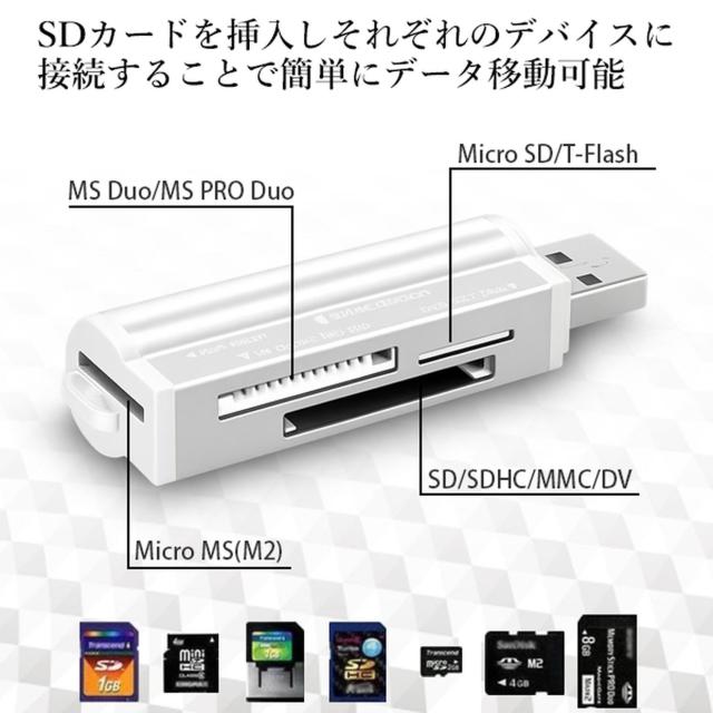 ・USBコネクタを搭載したカードリーダーなのでSDカードを挿入しそれぞれのデバイスに接続することで簡単にデータ移動ができます。