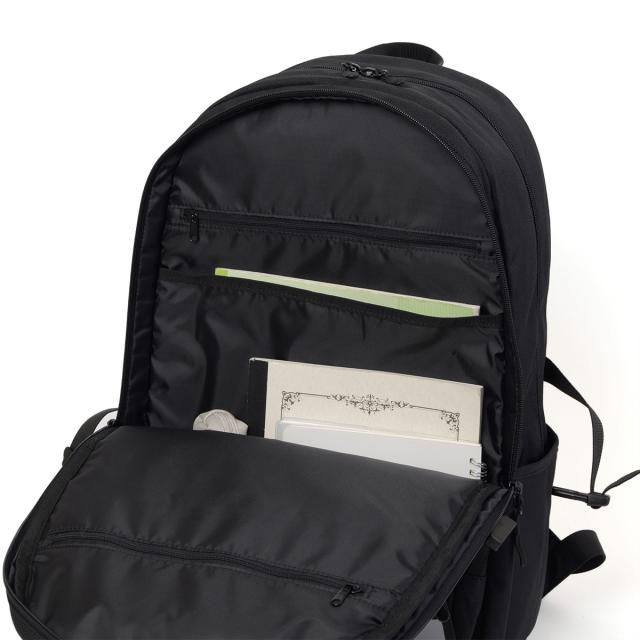 メインルームは2層式になっているため、一方に教科書、もう一方に着替えやお弁当を収納するなど、用途に応じて使い分けることができます。後方にはパソコンを入れるクッションポケットもあります。
