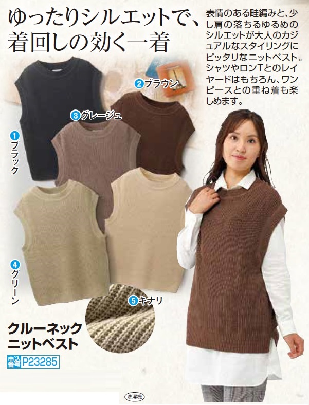 sale クルーネックニットベスト 全5色 トップス ベスト 畦編みニット 丸首 ブラック グレー ブラウン ベージュ レディース 婦人服 ミセス シニア 女性 ファッション 50代 60代 70代 80代 母の日 お母さん シンプル チョッキ 秋物 冬物 spi p23285 p25480 p26442 p25578