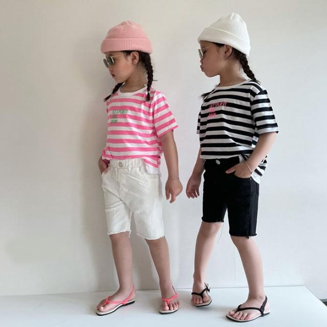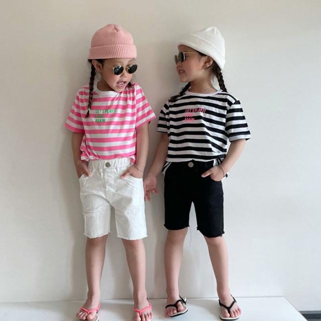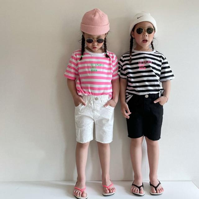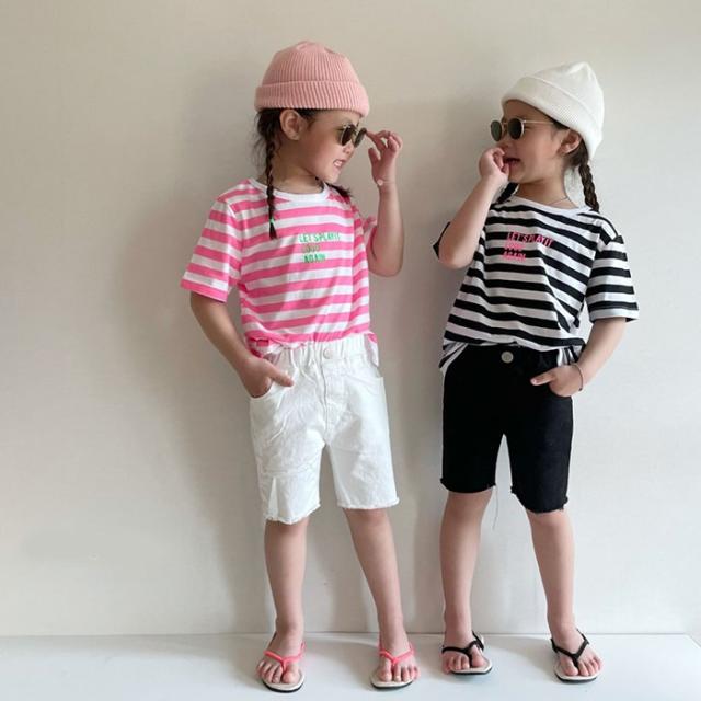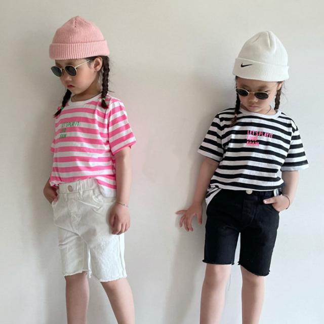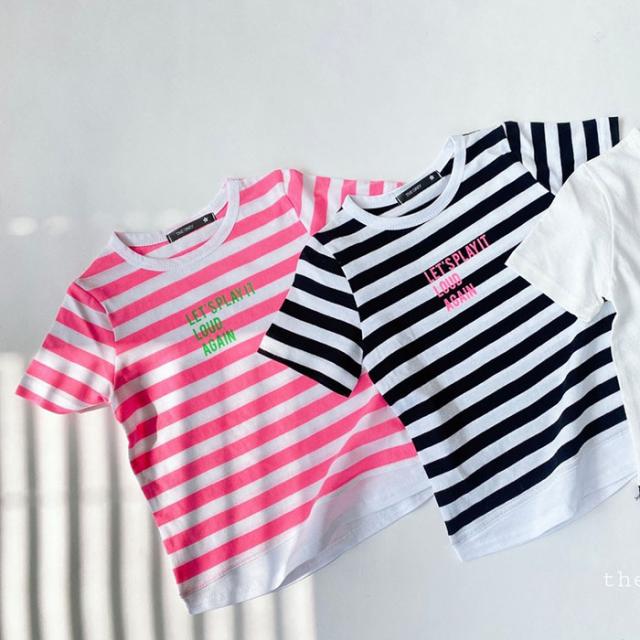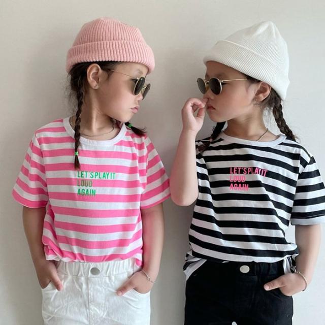 韓国子供服 半袖Tシャツ ボーダー ロゴ ワンポイントロゴ ボーダーTシャツ ピンク ブラック 双子コーデ 親子コーデ 90 100 110 120 130 140 150 160 プリントTシャツ 子供用 女の子 男の子 ベビー お洒落 カワイイ 【メール便送料無料】