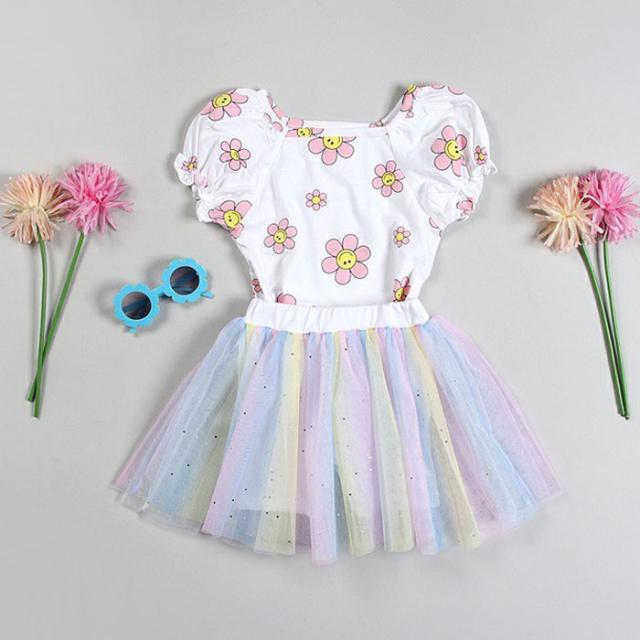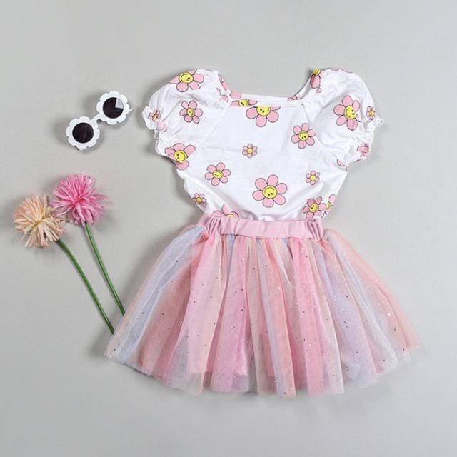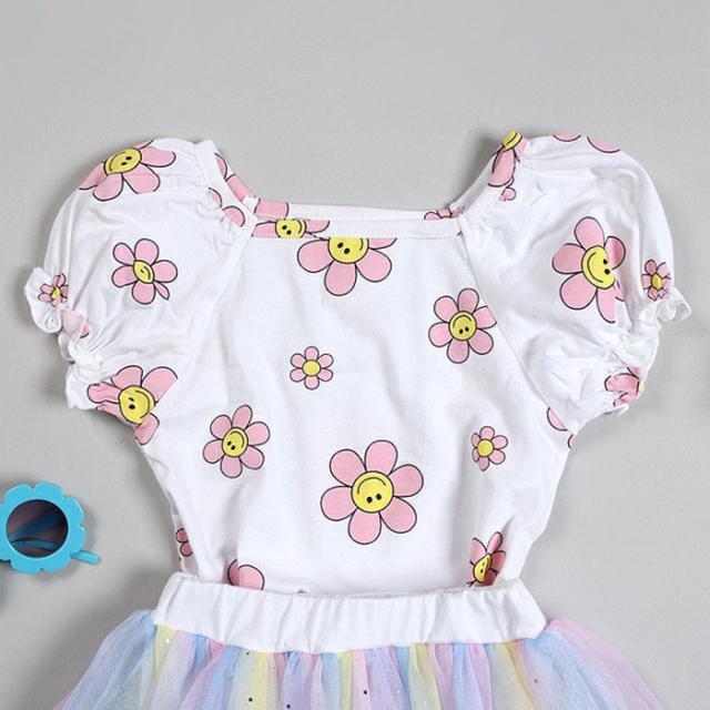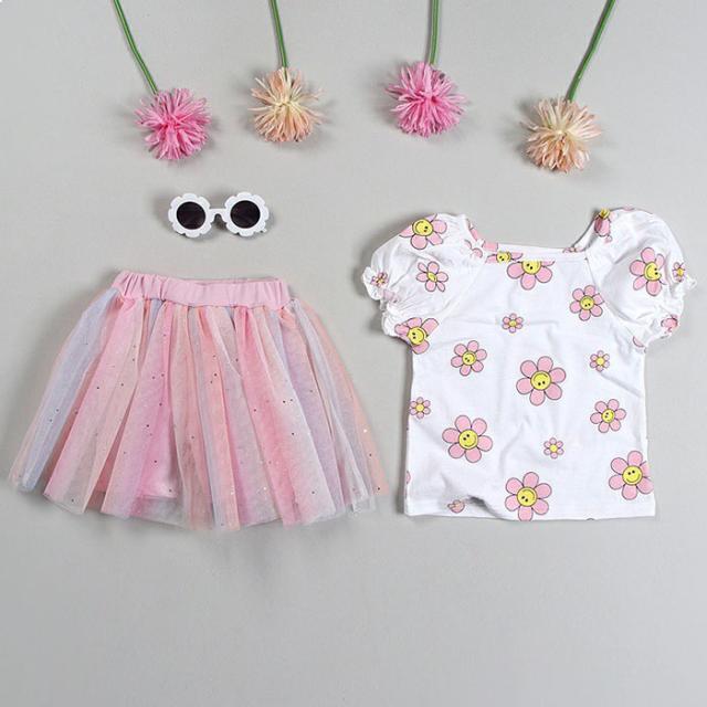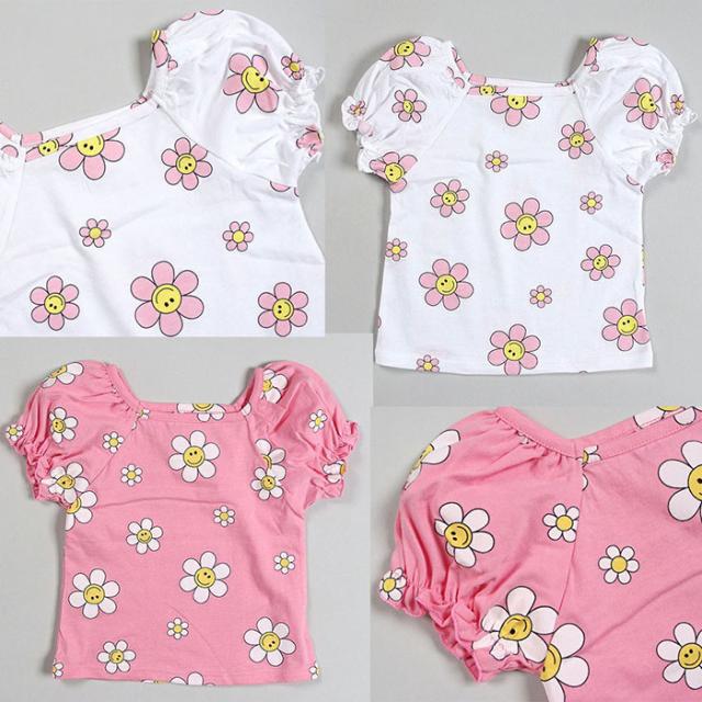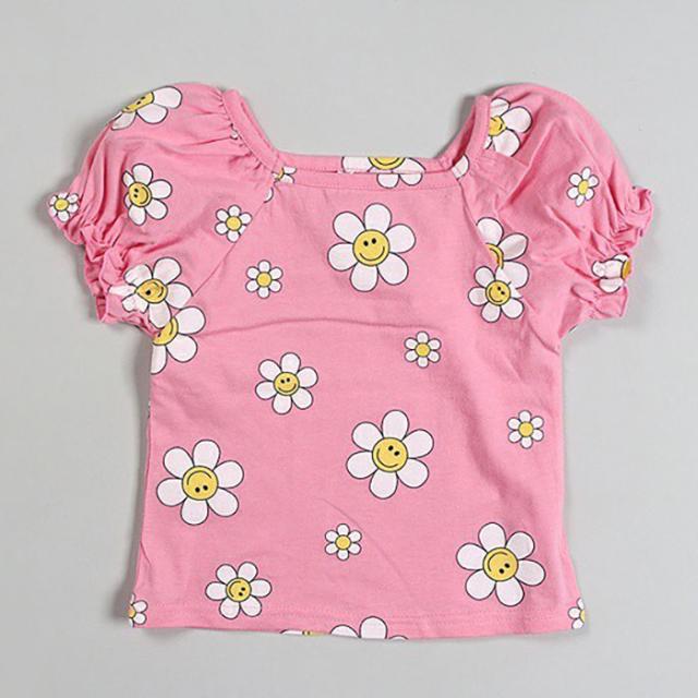 韓国子供服 半袖Tシャツ フラワー スマイル スマイルフラワー 花柄 Tシャツ 90 100 110 120 130 プリントTシャツ パフ袖 パフスリーブTシャツ 子供用 女の子 ベビー お洒落 カワイイ オシャレキッズ【メール便送料無料】