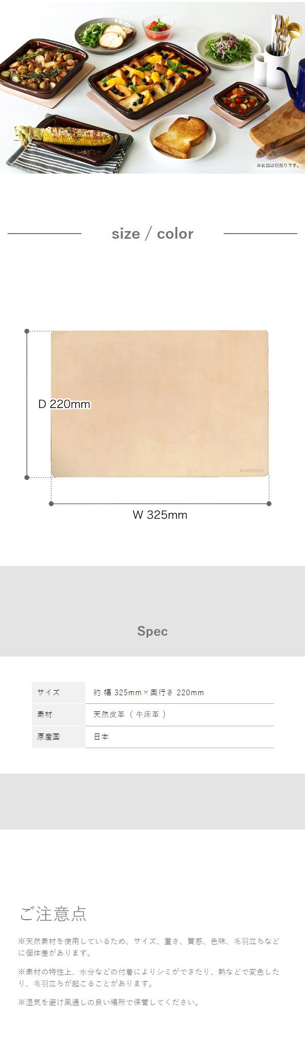 スタイリッシュな角型の耐熱皿「 Flying Saucer オリジナルベイクウェア 104 」に合わせて使える『 レザーマット 104 』。素材は環境に配慮し、鞄や靴用の革のうちほとんどが廃棄される床革をアップサイクルしたもの。幅約32.5cmの長方形で、立てて収納できる強度があります。グラタン皿やラザニア皿、鋳物鍋、スキレットなどの鍋敷きにおすすめ。ナチュラルな風合いがテーブルを優しく彩ります。
