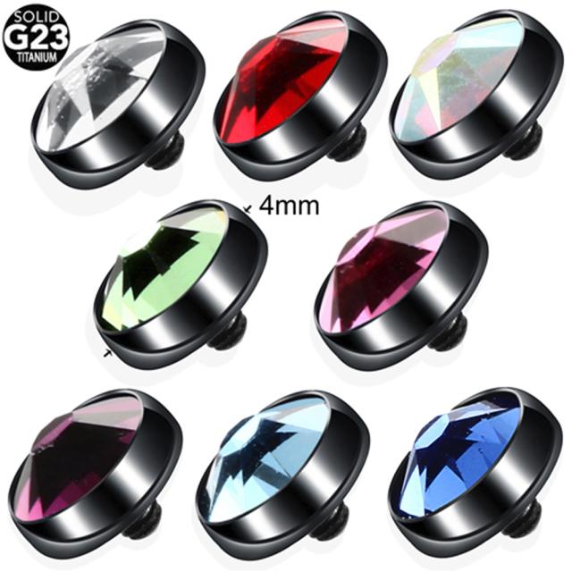 黒色にブラックメッキしたチタングレード23(G23)素材のジュエルが大きく見える丸台座に紫色パープル、青色サファイア、クリスタル、ABレインボー、黄緑色グリーンペリドット、水色ライトブルー、ピンク、赤色レッドのキュービックジルコニアをセットした14ゲージの内ネジタイプのシャフトのボディピアス用キャッチ。