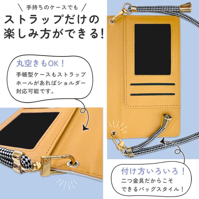 手帳型ケースも丸穴があればストラップのみで装着可能です。