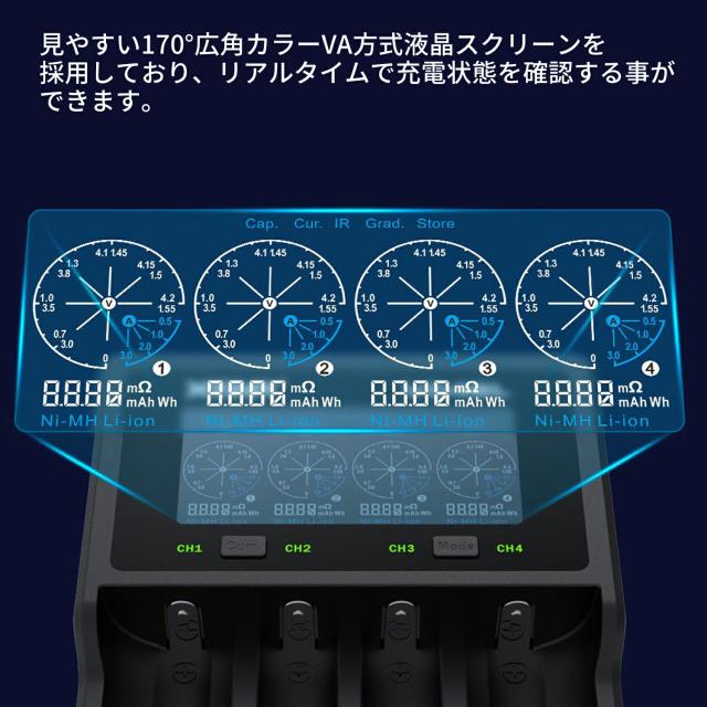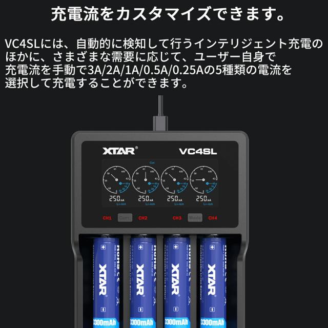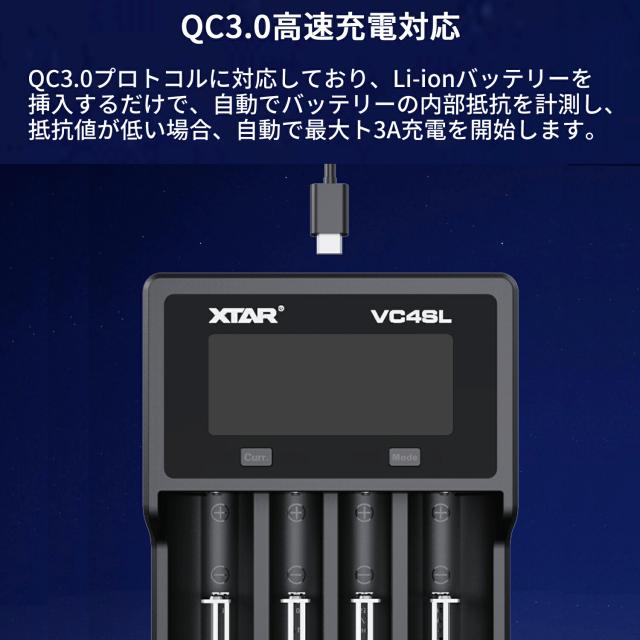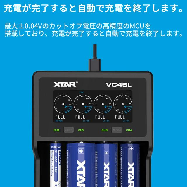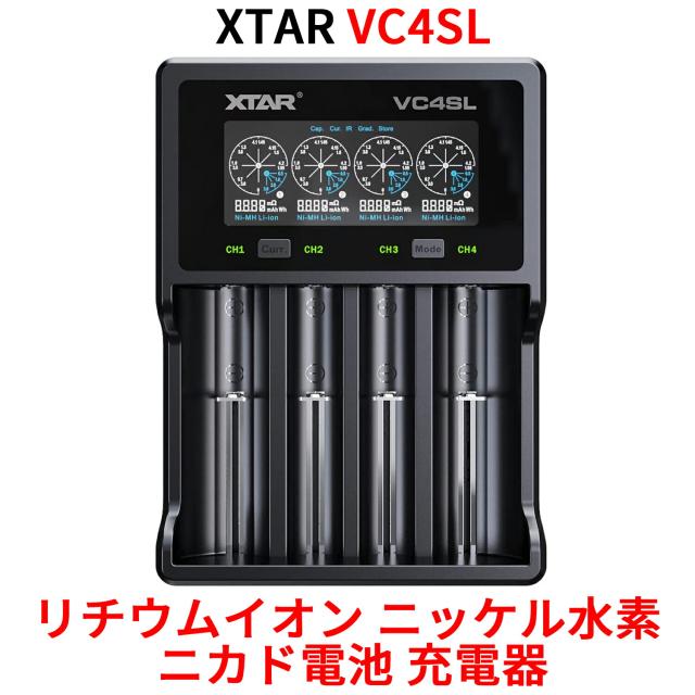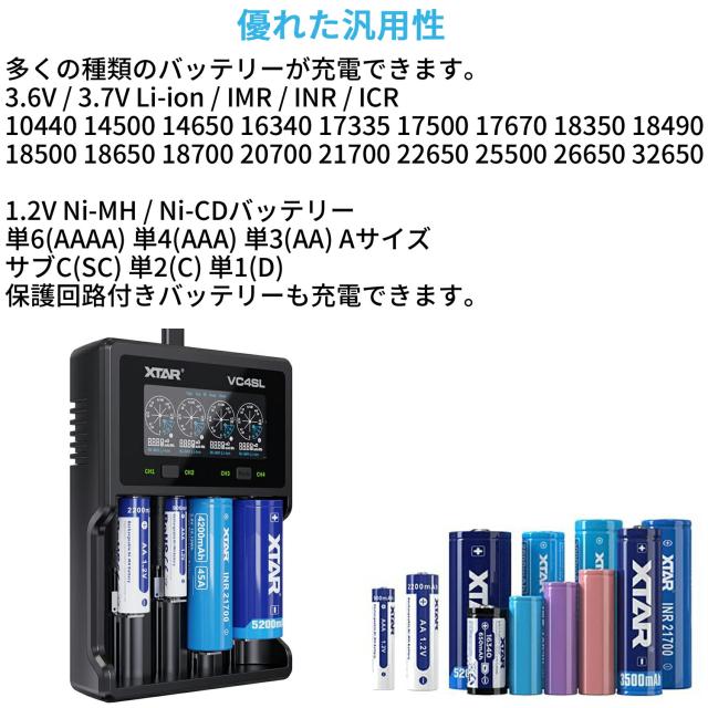 XTAR エクスター VC4SL リチウムイオン Ni-MH Ni-CD 充電器 エネループ 充電可能 高性能 バッテリーチャージャー Li-ion IMR INR ICR 4スロット QC3.0 急速 高速 充電 USB タイプC 単6 単5 単4 単3 単2 単1 スマホ スマートフォン 電池 充電池 アイフォン アンドロイド