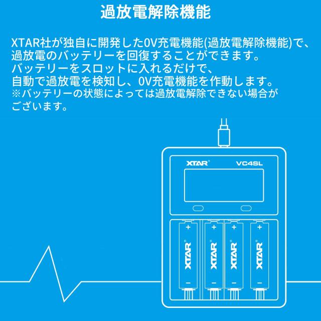 XTAR社が独自に開発した0V充電機能(過放電解除機能)で、過放電のバッテリーを回復することができます。