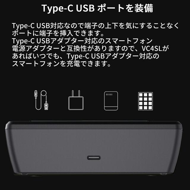 Type-C USBアダプター対応のスマートフォン電源アダプターと互換性がありますので、VC4SLがあればいつでも、Type-C USBアダプター対応のスマートフォンを充電できます。