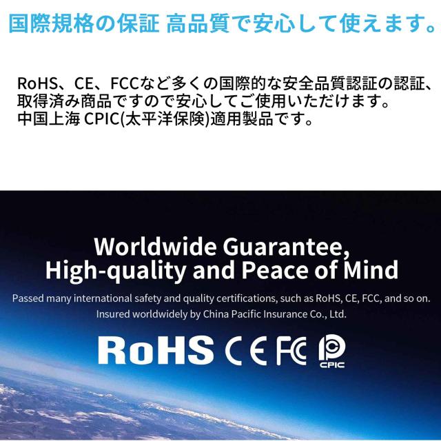 RoHS、CE、FCCなど多くの国際的な安全品質認証の認証、取得済み商品ですので安心してご使用いただけます。