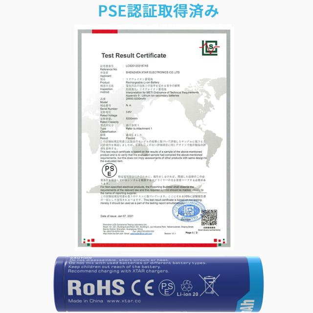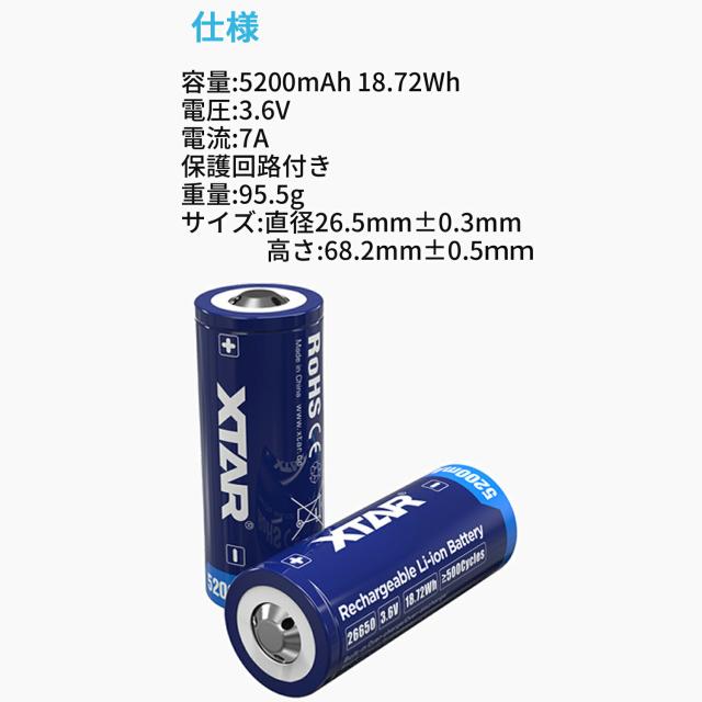 XTAR 26650 5200mAh 3.6V 充電式 リチウムイオン電池 7A 18.72Whバッテリー 保護回路付き リチウムイオンバッテリー リチウム電池 充電池 フラッシュライト 懐中電灯 用 リチウムイオン 電池 バッテリー 保護回路 搭載 エクスター