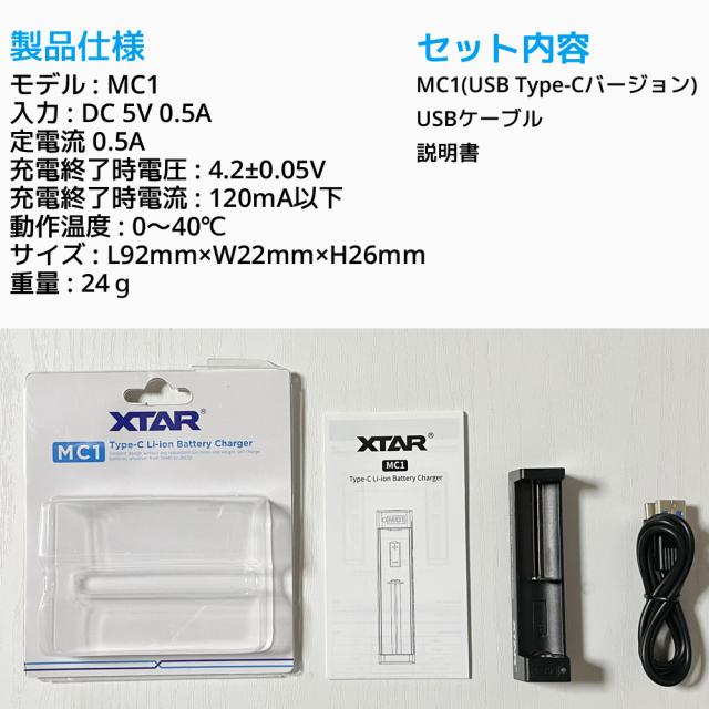 XTAR エクスター MC1 USB-C 入力 リチウムイオン電池 充電器 高速 急速 USB Li-ion IMR INR ICR 電池 バッテリー マルチサイズ 対応 16340 18650 18500 リチウムイオン リチウムマンガン リチウムニッケル コバルト電池 USB-C USB C