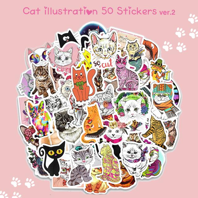 ネコ イラストレーション ステッカー ver.2 50枚セット PVC 防水 シール ねこ 猫 キャット スーツケース MacBook
