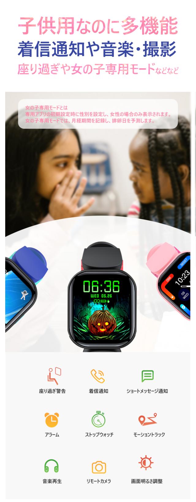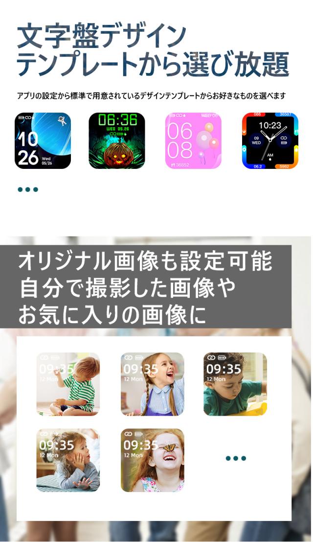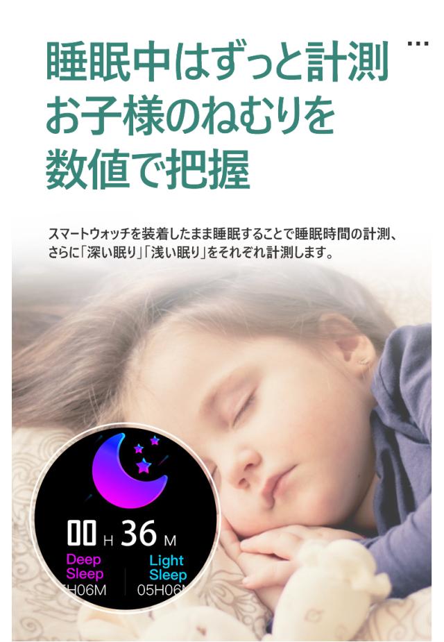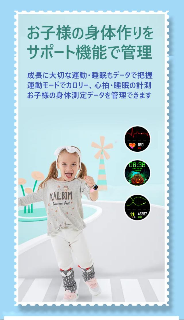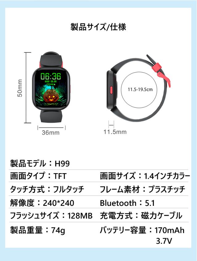 | 商品特徴 | 【1.4インチIPSタッチスクリーン】 腕時計のタッチパネルは感圧式ではなく、スマホと同じく静電容量方式を採用、さらにクリアなIPSディスプレイで滑らかな手触りを実現!スムーズなタッチ操作が可能に 【多種多様な子供に向ける文字盤】 時計画面のデザインがたくさんあります。大人っぽくてクールなデザインや可愛くてポップなデザインなど様々なスタイルがありますので、その日の気分やお好みに合わせて変えることができます! 【心拍計測】 光学式心拍計測(赤外線センサー)技術が利用されたので、フィットネストウォッチを腕に装着するだけでいつでもどこでも簡単に24時間心拍の測定が可能です。リアルタイム計測なので運動中はもちろん、日々の日常生活の中でも簡単に心拍を計測し、健康管理にはとても楽です。 【睡眠データの記録】 睡眠質は私たちの生活に大きな影響を与えます。子供はぐっすり眠ることができ、子供の体に大いに役立ちます。 H99キッズ用スマートウォッチは、お子様の睡眠を記録できます。これらの睡眠データを通じて、保護者は状況に応じてお子様に最適な睡眠計画を立て、子供に十分な睡眠時間を確保します。 【多運動モード】 Bluetoothで同期すれば、アプリで19種類の運動データが見え、毎日の生活習慣の改善や日常健康管理に役立ちます。また、19種類の運動モードも搭載されていて、スポーツを始める前運動モードを起動すれば、よりに高精度な運動データを測られます。 【時間の使い方がもっと上手に】 ストップウォッチ、アラーム機能付き、時間を設定することで学習と遊び時間をはっきり分けます。子供たちは効率よく時間を使う習慣を身に付けましょう。 【 IP68防水】 IP68のハイレベル防水防塵で、手洗い、顔洗い、雨の日にも取り外す必要がありません。泳ぐこともできますが、お湯などに対応できません。※お風呂、サウナ、温泉水や温泉の湯気及び高い水圧は故障の原因となります。 【バッテリー長持ち】 内蔵170mAhリチウム電池、1回充電で長くお使い頂けます。最長1週間利用可能(*低使用率の場合)、省エネで放射線を低減し、親にとってはナイスチョイスの逸品です。 【便利なUSB充電式】 マグネット吸着式 、充電には便利です。。 |