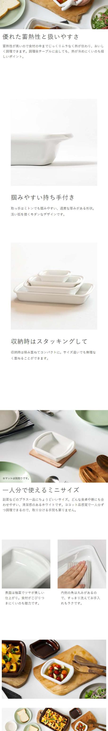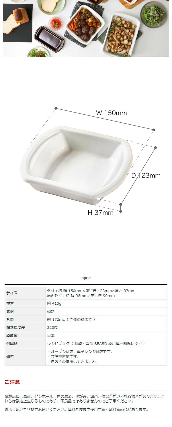 オーブンや電子レンジで加熱調理できる角型の耐熱皿。調理用のオーブン皿と食器の用途を兼ねており、副菜やミニグラタン皿に適した一人分サイズ。食洗機OKでお手入れもラクです。