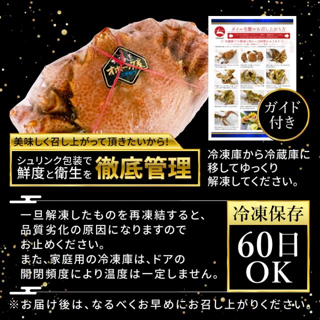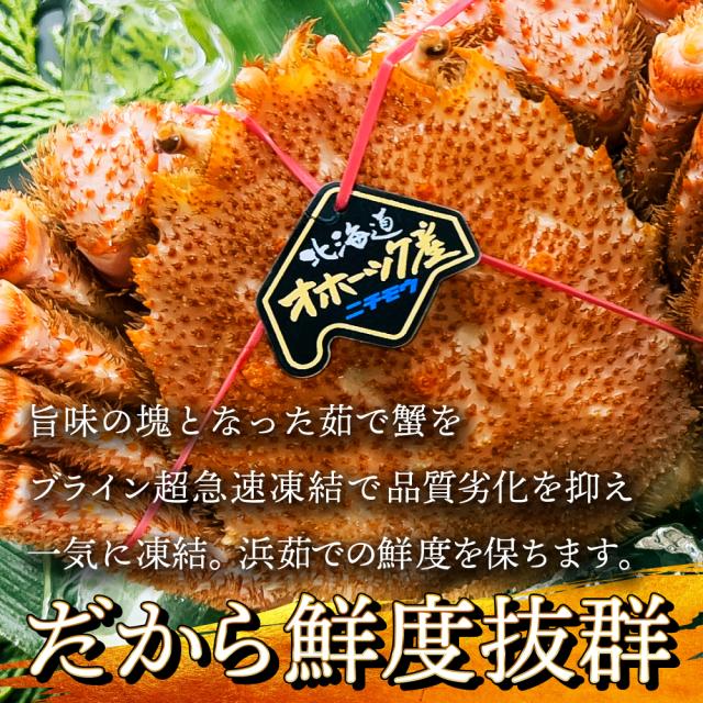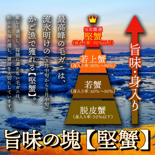 極寒の海で育った毛ガニは 身の引き締まり・味ともに最高の仕上がりです。