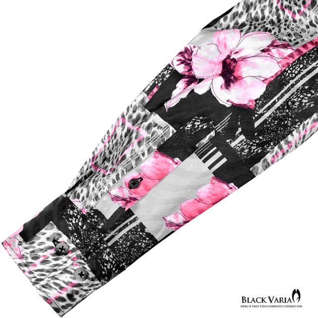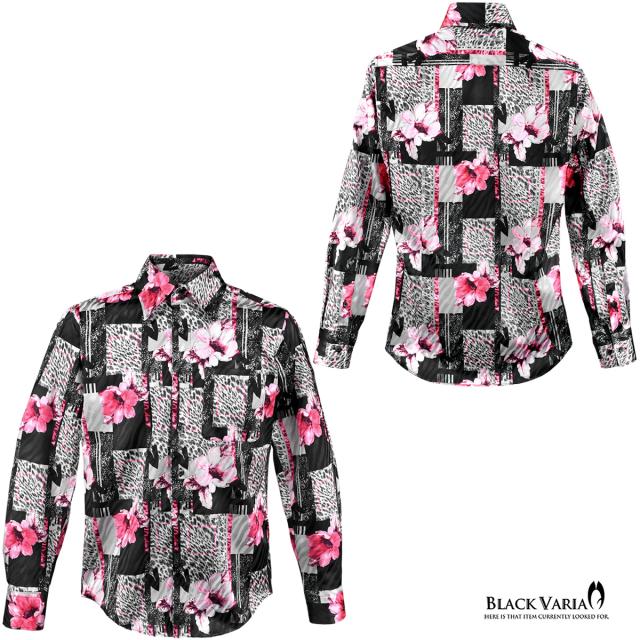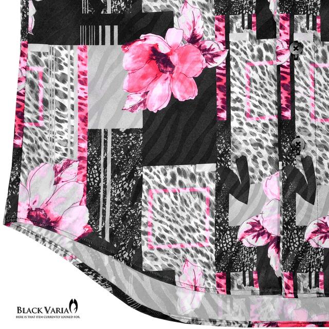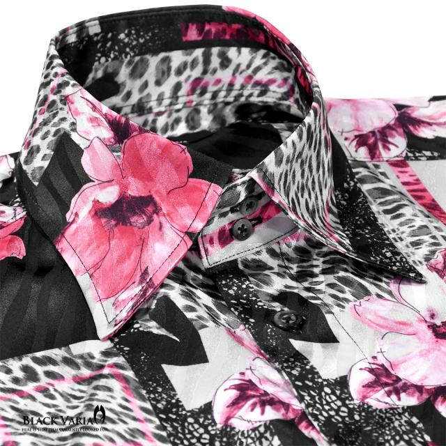 サテンシャツ ドゥエボットーニ 豹×ゼブラ パッチワーク 花 ドレスシャツ レギュラーカラー ジャガード パーティー メンズ(ブラック黒×ピンク桃) 211801