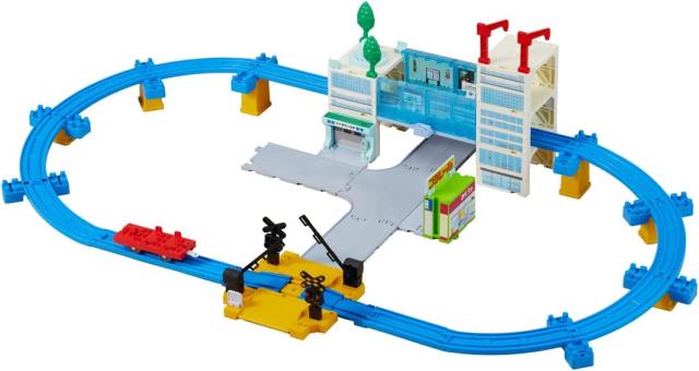 【セット内容】駅本体(1),屋根(2),ビルブロック本体(5),ビルパネル(小)(10),ビルパネル(大)(2),踏切(本体×1、踏切警報機×2)(1),入口パーツ、バス停 各(1),屋上看板、噴水 各(1),公園ベンチ(2),クレーン(2),駅名ボード、柵 各(2),立ち木(2),たてものブロック(1),プレート(2),坂曲線レール(A、B) 各(4),坂曲線レール専用橋脚(L,M,S) 各(2),直線レール(2),1/2直線レール(2),ジョイントパーツ(1),直線道路(3),T字道路(1),貨車(1),シール(1),取扱説明書(1)