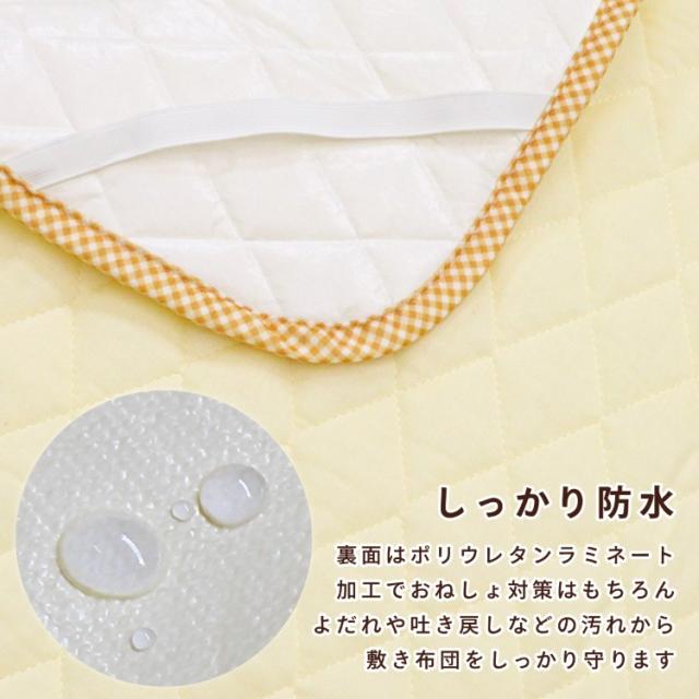 表側は吸湿性・保温性に優れた綿100%ダブルガーゼを使用したふかふかキルト、裏側は防水仕様。