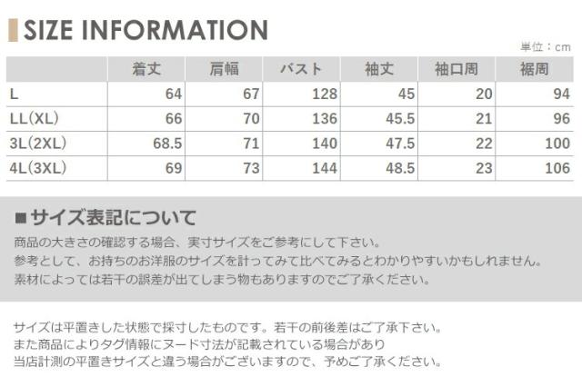 4L(3XL):着丈69 肩幅73 B144 袖丈48.5 袖口周23 裾周106