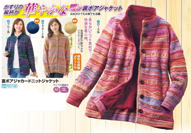 アウター ジャケット セーター ピンク ブルー イエロー レディース 秋冬 裏ボア ジャカード ニットジャケット 全3色 婦人服 ミセス シニア 女性 シニアファッション 40代 50代 60代 70代 80代 母の日 お母さん 前ボタン 裏ボアジャケット カジュアル fri p23192