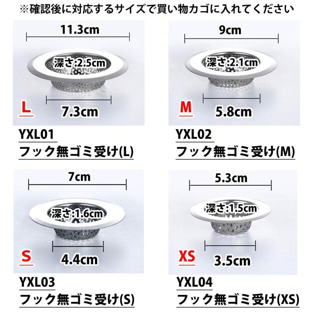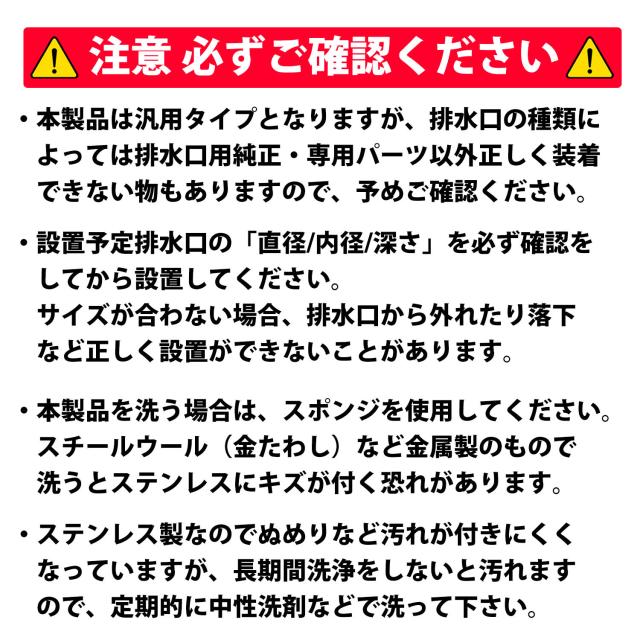 ・設置予定排水口の「直径/内径/深さ」を必ず確認をしてから設置してください。サイズが合わない場合、排水口から外れたり落下など正しく設置ができないことがあります。