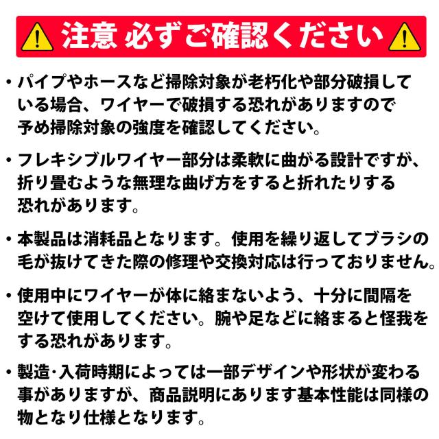 ・パイプやホースなど掃除対象が老朽化や部分破損している場合、ワイヤーで破損する恐れがありますので予め掃除対象の強度を確認してください。