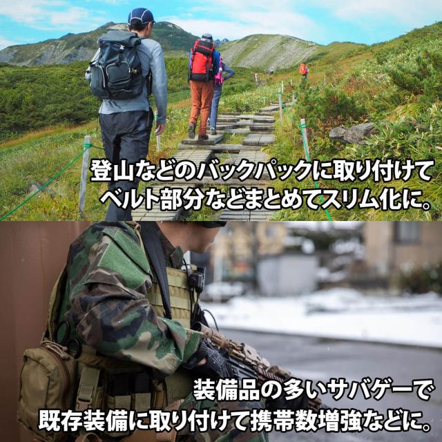・取り付ける対象のベルトやバンドに強度がある事を確認してください。強度がない部位に取り付けて装備品を固定などした際、取り付け側が破損する恐れがあります。