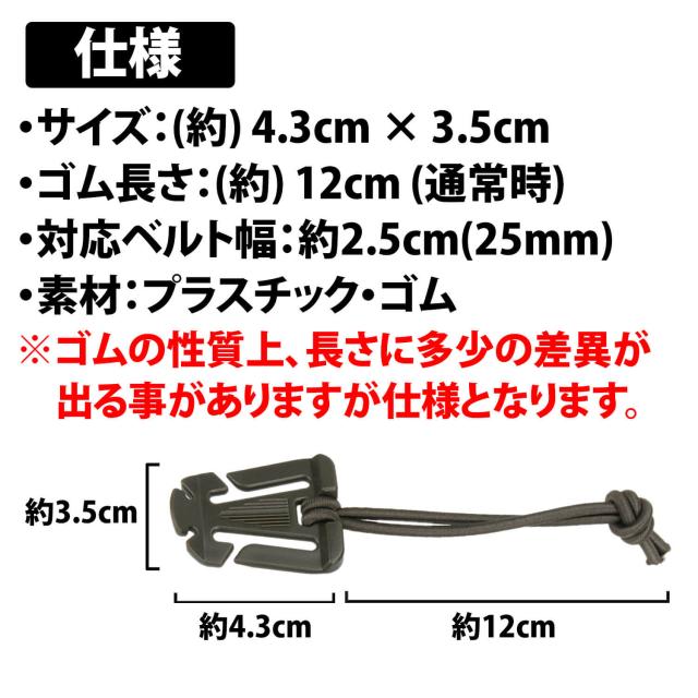 ・本製品を装着して装備品等を外部に固定する際は、必ずゴムを数回巻いてしっかり固定してください。ゴムでの締付けが緩いと途中で落下する恐れがあります。