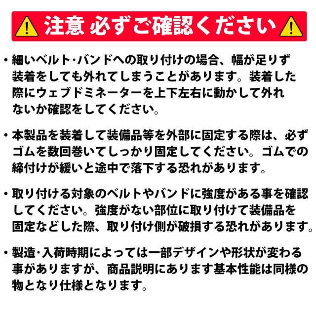 ・細いベルト・バンドへの取り付けの場合、幅が足りず装着をしても外れてしまうことがあります。装着した際にウェブドミネーターを上下左右に動かして外れないか確認をしてください。