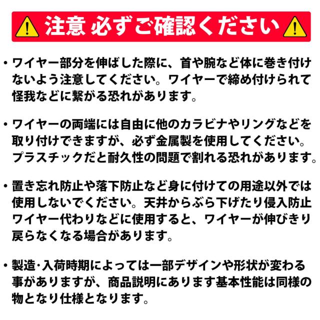 ・置き忘れ防止や落下防止など身に付けての用途以外では使用しないでください。天井からぶら下げたり侵入防止ワイヤー代わりなどに使用すると、ワイヤーが伸びきり戻らなくなる場合があります。