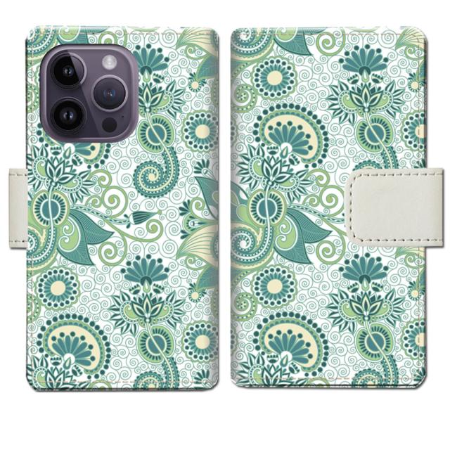 iPhone14Pro 手帳型 ケース カバー アイフォン14プロ ‐ グリーンペイズリーデザイン - 手帳型 スマホケース 手帳ケース 手帳カバー スマホカバー