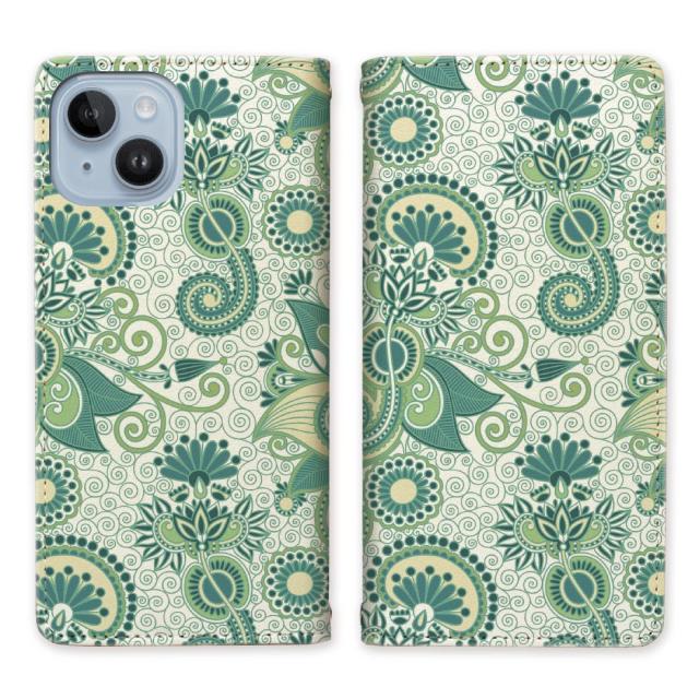 Apple iPhone14 ベルトなし スタンド機能 - グリーンペイズリーデザイン - 手帳型 スマホケース 手帳ケース 手帳カバー スマホカバー マグネットでピタッと閉じる