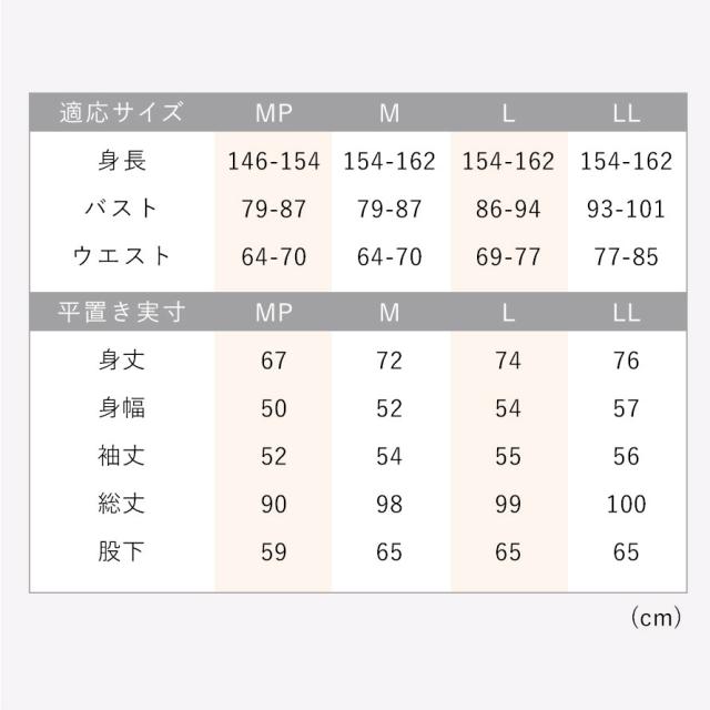 ■サイズ:MP/身長146-154、バスト79-87、ウエスト64-70、身丈67、身幅50、袖丈52、総丈90、股下59、M/身長154-162、バスト79-87、ウエスト64-70、身丈72、身幅52、袖丈54、総丈98、股下65、L/身長154-162、バスト86-94、ウエスト69-77、身丈74、身幅54、袖丈55、総丈99、股下65、LL/身長154-162、バスト93-101、ウエスト77-85、身丈76、身幅57、袖丈56、総丈100、股下65cm